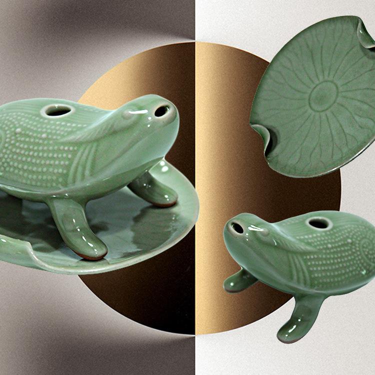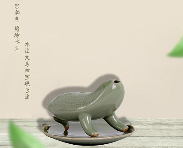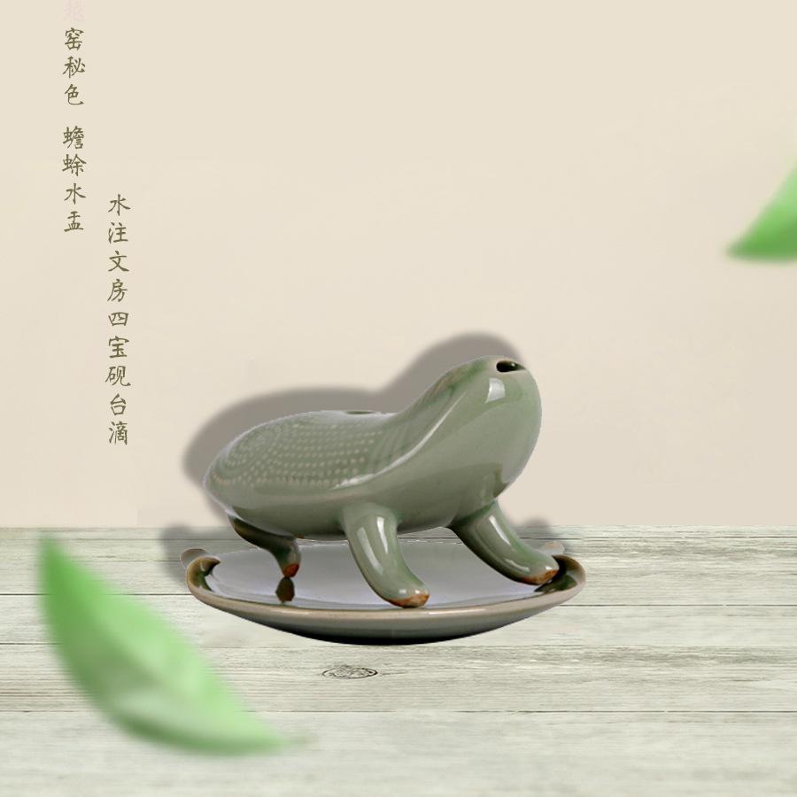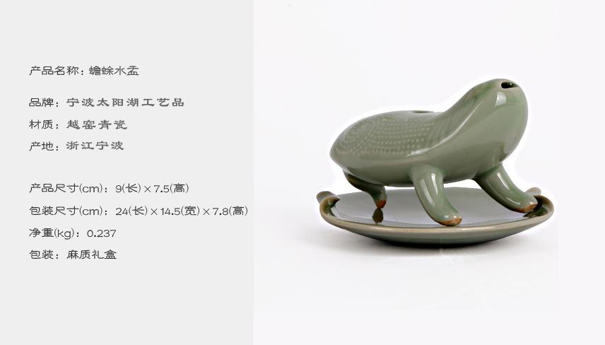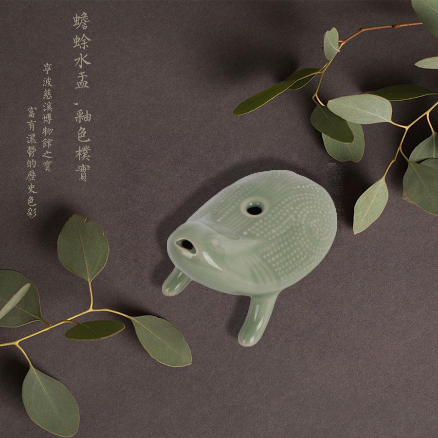 产品说明:【名称】 越窑青瓷蟾蜍水盂 【品牌】 宁波太阳湖 【材质】 越窑青瓷 【产地】 宁波 【尺寸】 长 9cm 、高 7.5cm(手工测量略有误差)